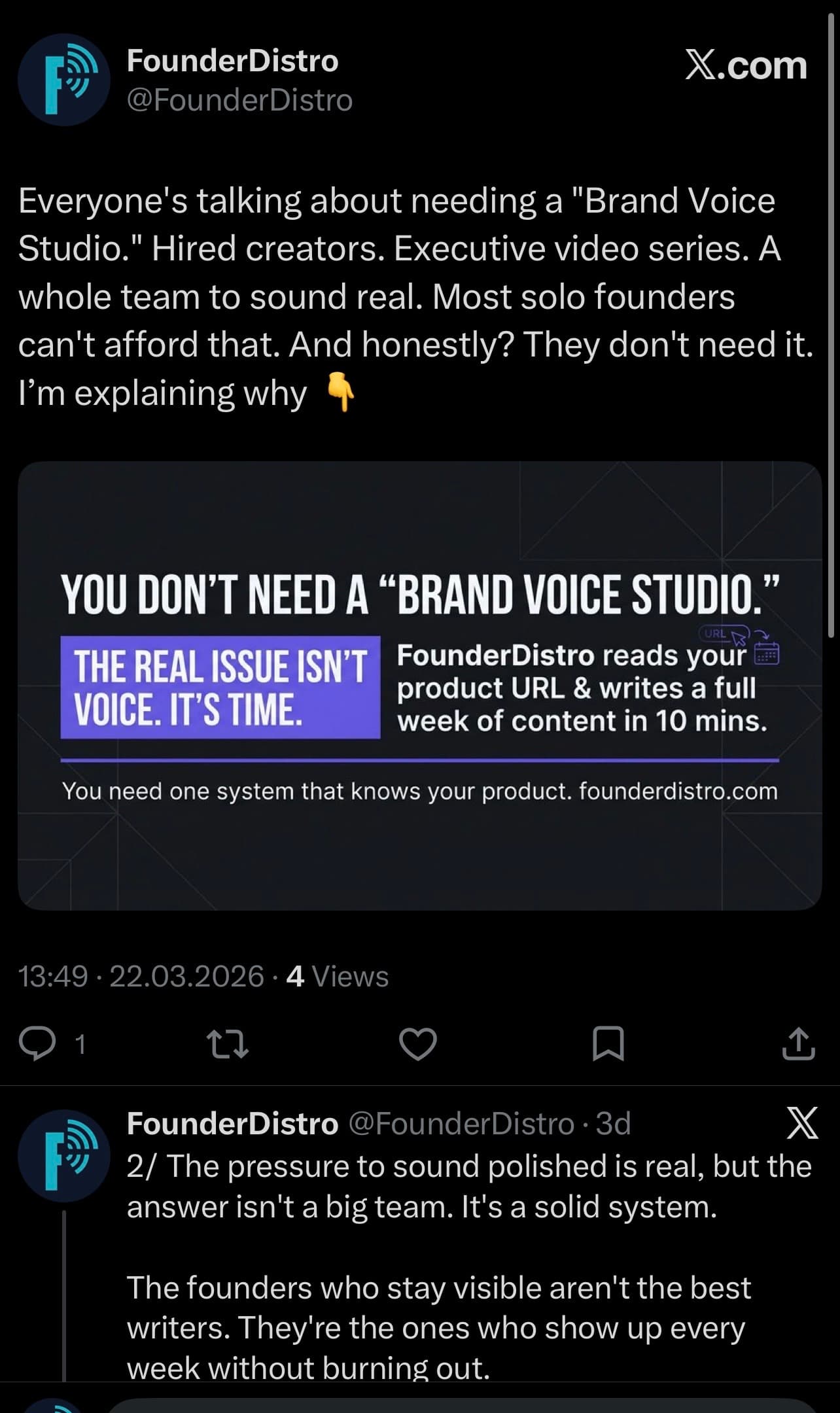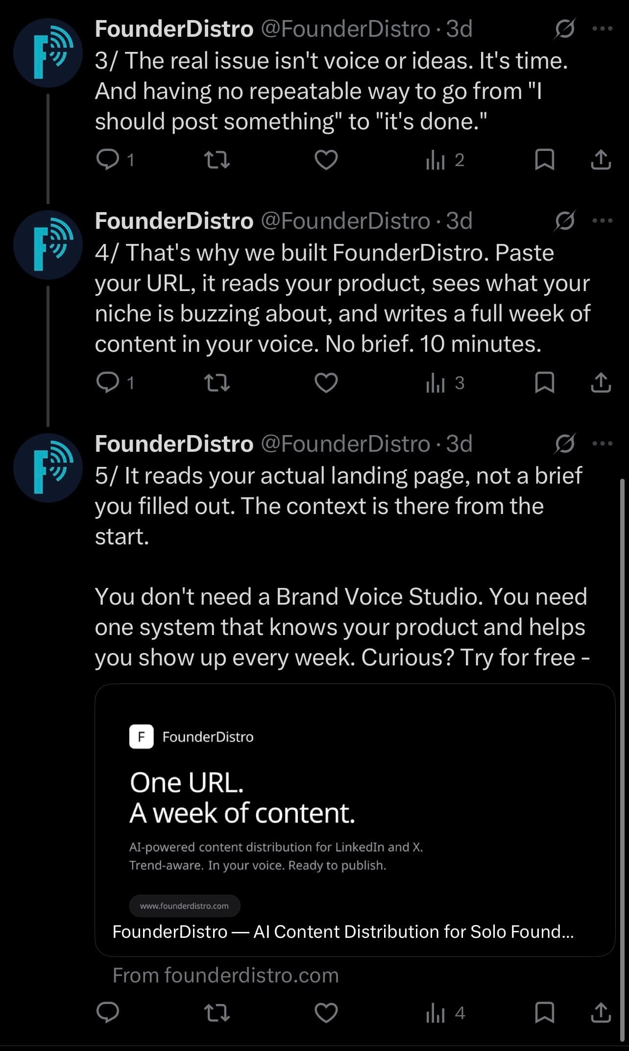 Paste your product URL — FounderDistro reads your product, checks what your niche is talking about right now, and generates a full week of LinkedIn & X content in your voice. No briefs. No ghostwriter. No burnout.