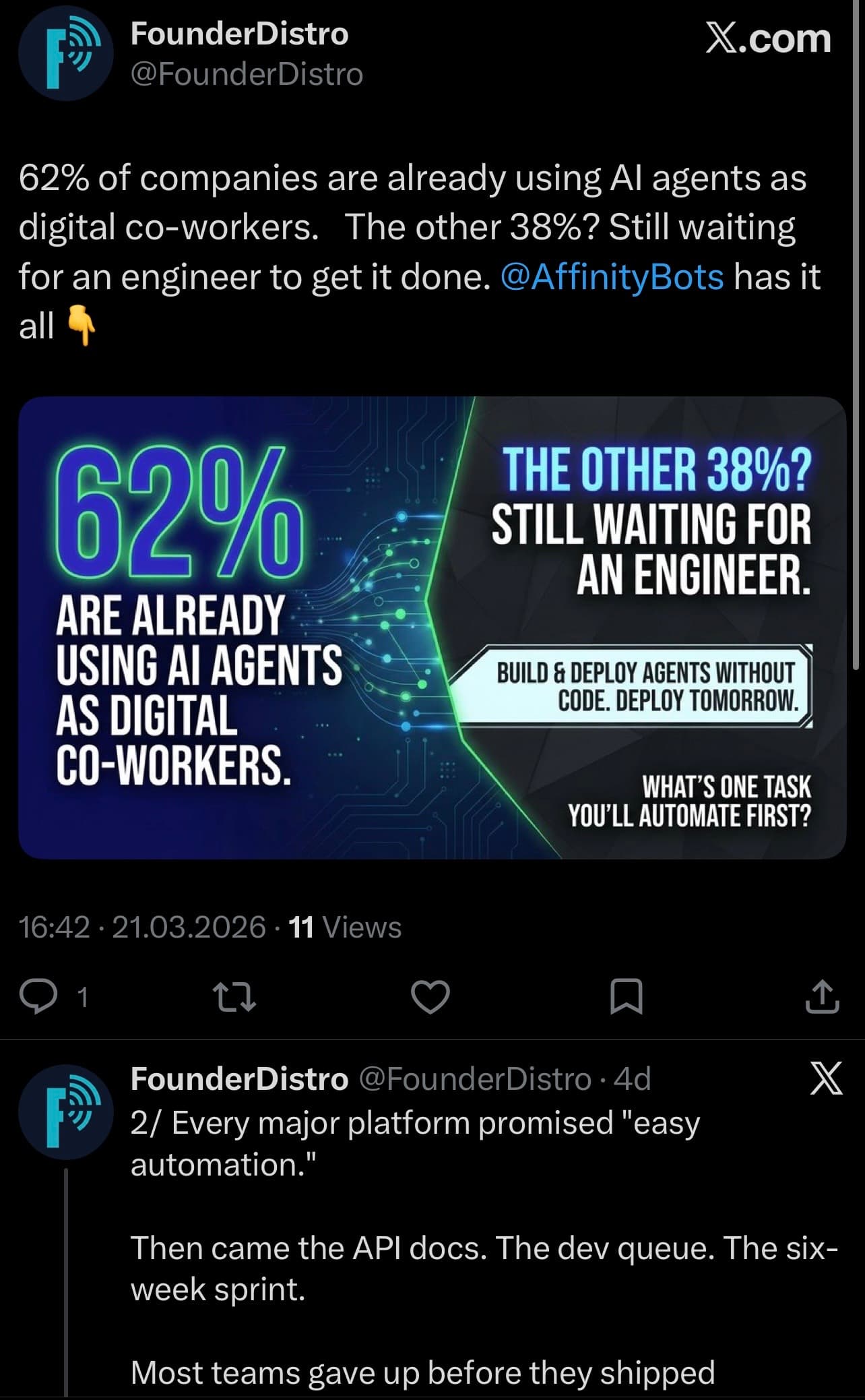 “I was building in complete silence for 8 months. Great product, nobody knew it existed. FounderDistro got me posting consistently in week one — without spending hours I don't have.”