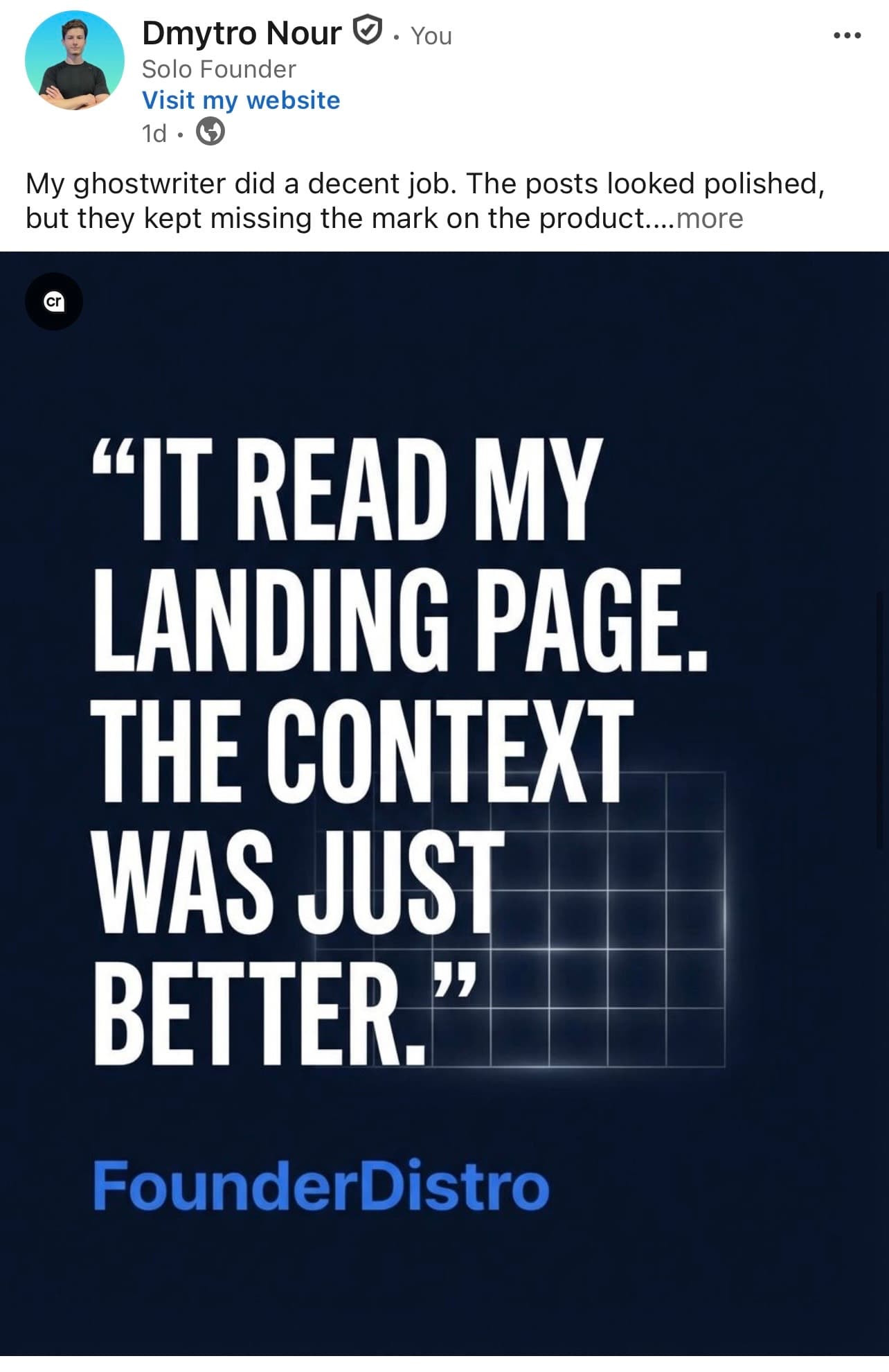 “I was paying a ghostwriter $800/mo. Got decent content but they didn't really understand my product. FounderDistro reads my actual landing page. The context is just better from day one.”