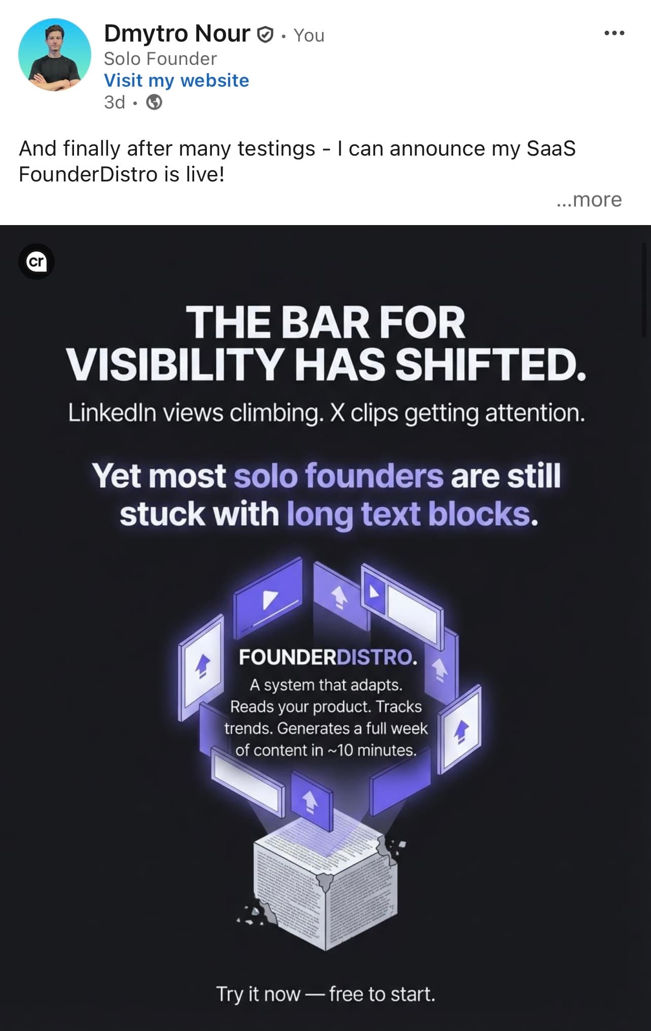 “I tried writing my own LinkedIn posts. Spent 2 hours on one post that flopped. With FounderDistro I get a full week of content in 10 minutes and it actually sounds like me.”